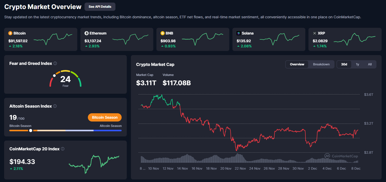Image 1: Crypto Market Overview dashboard from CoinMarketCap shows a cautious rebound across the market. BTC trades at $91,597 (+2.18%), ETH at $3,137 (+2.93%), BNB at $903 (+0.93%), SOL at $135.92 (+2.08%), and XRP at $2.0829 (+1.74%). The Fear & Greed Index sits at 24 (Fear), while market cap holds near $3.11T with $117.08B in volume. The chart highlights a steady climb from the November 30 dip near $2.9T, tracking a 30-day recovery into December 8. The Altcoin Season Index at 19/100 reinforces Bitcoin Season, and the CMC 20 Index continues its upward path toward $194.33 from early November.