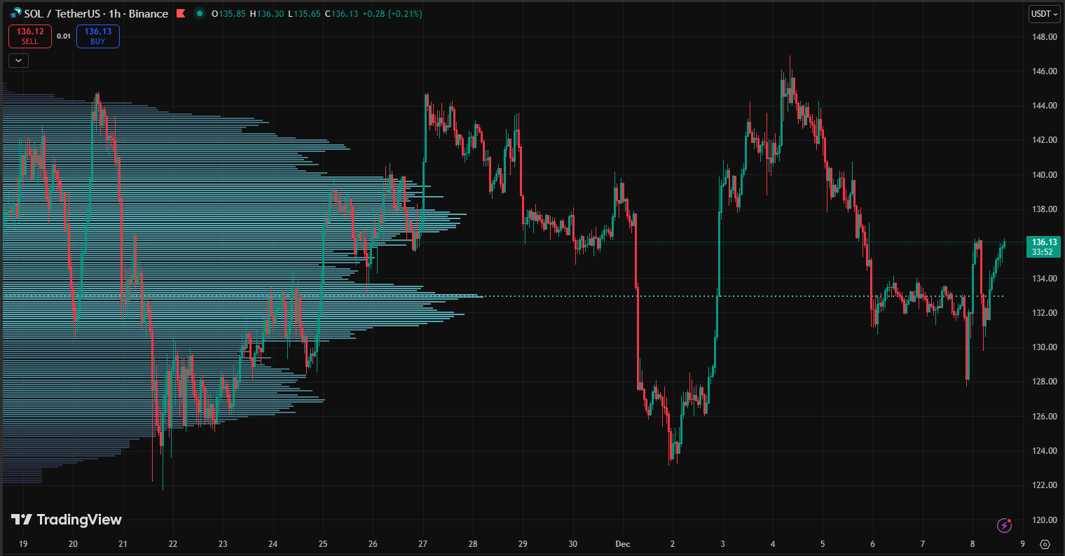 Solana trades at $136.13, up 0.21% on the session. Price bounced cleanly from $128.00, a support level Solana has defended several times in the past two days. The range stays tight between $128.00–$137.00, and SOL now sits just under $136.30. A push through that level can send price toward $138.00, then $140.50. Losing $135.00 puts $134.00 and $131.00 back in play.