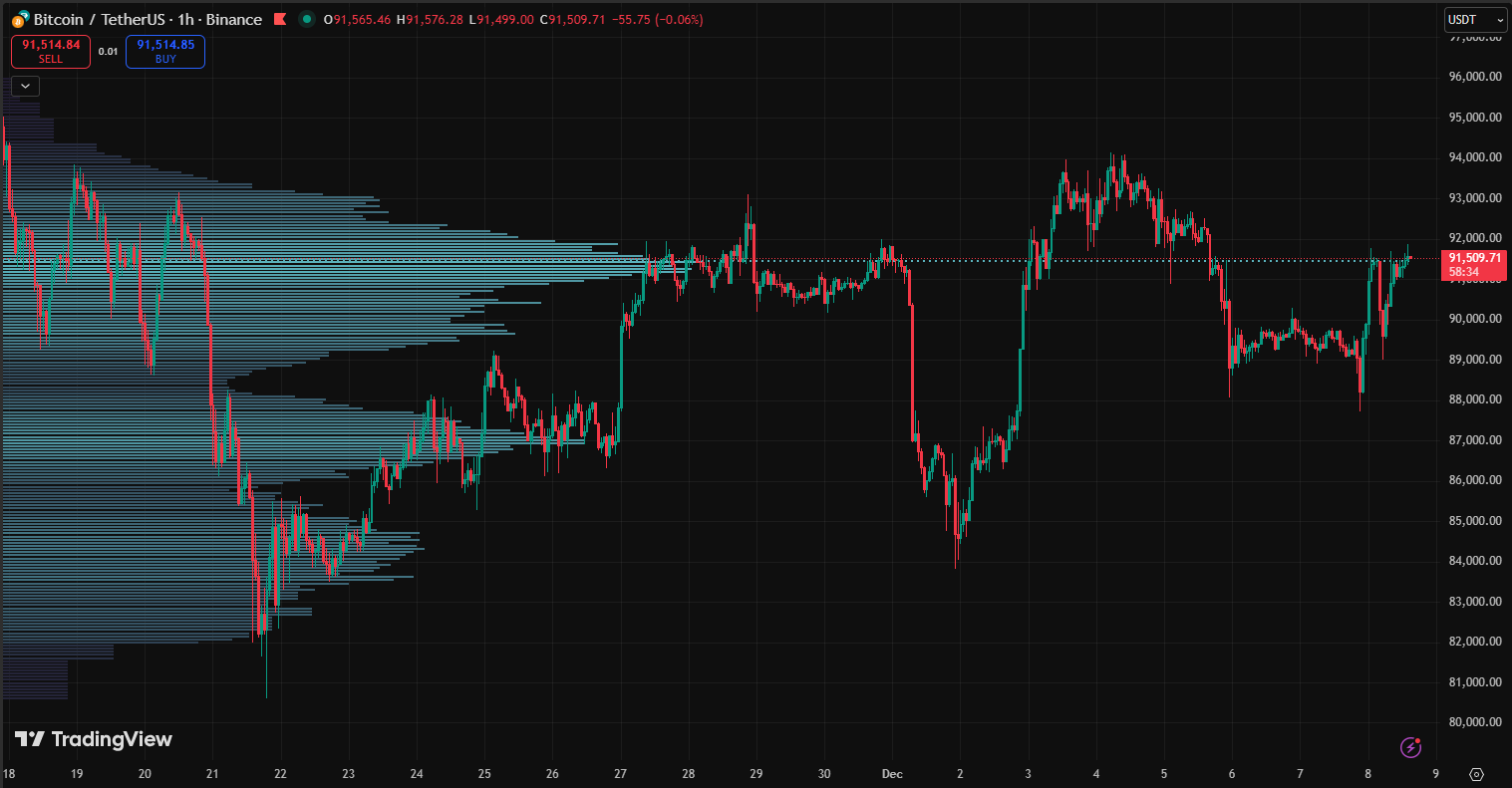 Bitcoin trades at $91,509, up 1.25% on the day. Price has lifted off the $88,000 low, which now acts as immediate support. BTC moves just under the $92,000 barrier, a level that has capped every attempt since late October and sits at the top of the broader $83,000–$96,000 range. A break above $92,000 can drive momentum toward $94,000 and $96,000. A slip under $88,000 brings $83,000 back into play and can push toward $80,000 if sellers press.