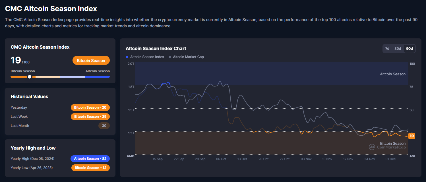 Image 3 underscores BTC’s dominance as the Altcoin Season Index holds at 19/100, firmly in “Bitcoin Season.” Readings landed at 20 yesterday, 25 last week, and 30 last month. The chart tracks the index in blue against altcoin cap in brown, sliding from the 82 peak on December 8, 2024 to the 12 low on April 26, 2025, then settling in the low-20s through December 1.