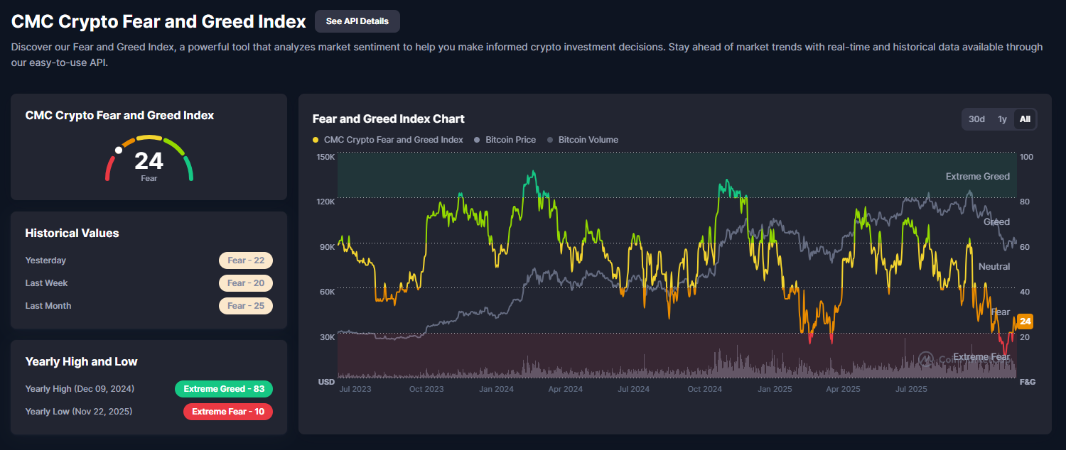 Image 2 captures a steady rise in sentiment. The dial sits at 24 (Fear), compared with 22 yesterday, 20 last week, and 25 last month. The yearly chart layers the index in yellow over BTC price in gray and volume in green, lifting from the 10 low on November 22, 2025 after the 83 peak on December 9, 2024. The move tracks closely with BTC’s rebound from the $84K trough.